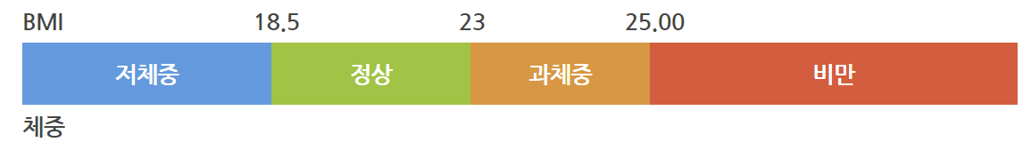 세계보건기구(WHO)에서는 BMI가 18.5 미만이면 저체중, 18.5 - 24.9이면 정상 체중, 25 - 29.9이면 과체중, 30 이상이면 비만으로 분류합니다.